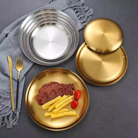 Yurtrain จานบาร์บีคิวทรงกลมสแตนเลสสไตล์เกาหลีอุปกรณ์สำหรับร้านอาหารจานสเต็กและจานผลไม้สำหรับการเดินทาง
